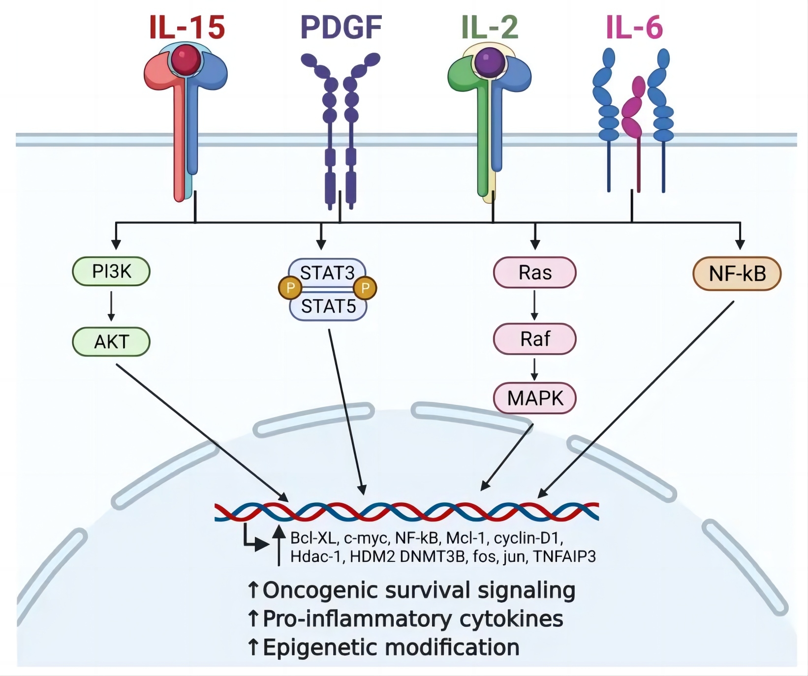 IL-15通过与细胞膜上的IL-15受体α亚基结合后,驻留在细胞表面,与附近的效应NK细胞或T细胞表面的IL-2R/IL-15Rβ-γc形成免疫突触,激活JAK1/JAK3和STAT3/STAT5途径、Syk激酶和磷脂酶C(PLC)γ、Lck激酶和Shc,导致PI3K/Akt和Ras/Raf/MAPK信号级联的激活。这些途径将导致Bcl2、Myc和Fos/Jun和NFkB激活的后续表达。