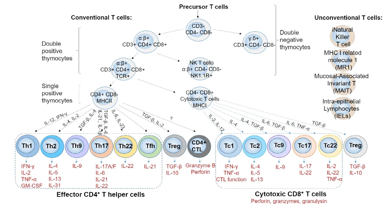 T 细胞是适应性免疫的核心,起源于骨髓前体细胞,经胸腺分化选择形成多亚群。常规 T 细胞包括 CD4 + 辅助 T 细胞(分 Th1/Th2 等亚群,调节免疫方向)、CD8 + 细胞毒性 T 细胞(杀伤感染 / 肿瘤细胞);非常规 T 细胞如 iNKT、MAIT 等参与特殊免疫防御。各亚群通过细胞因子与相互调节维持免疫稳态,其功能异常与自身免疫病、肿瘤等疾病相关,是免疫研究与治疗的关键靶点。