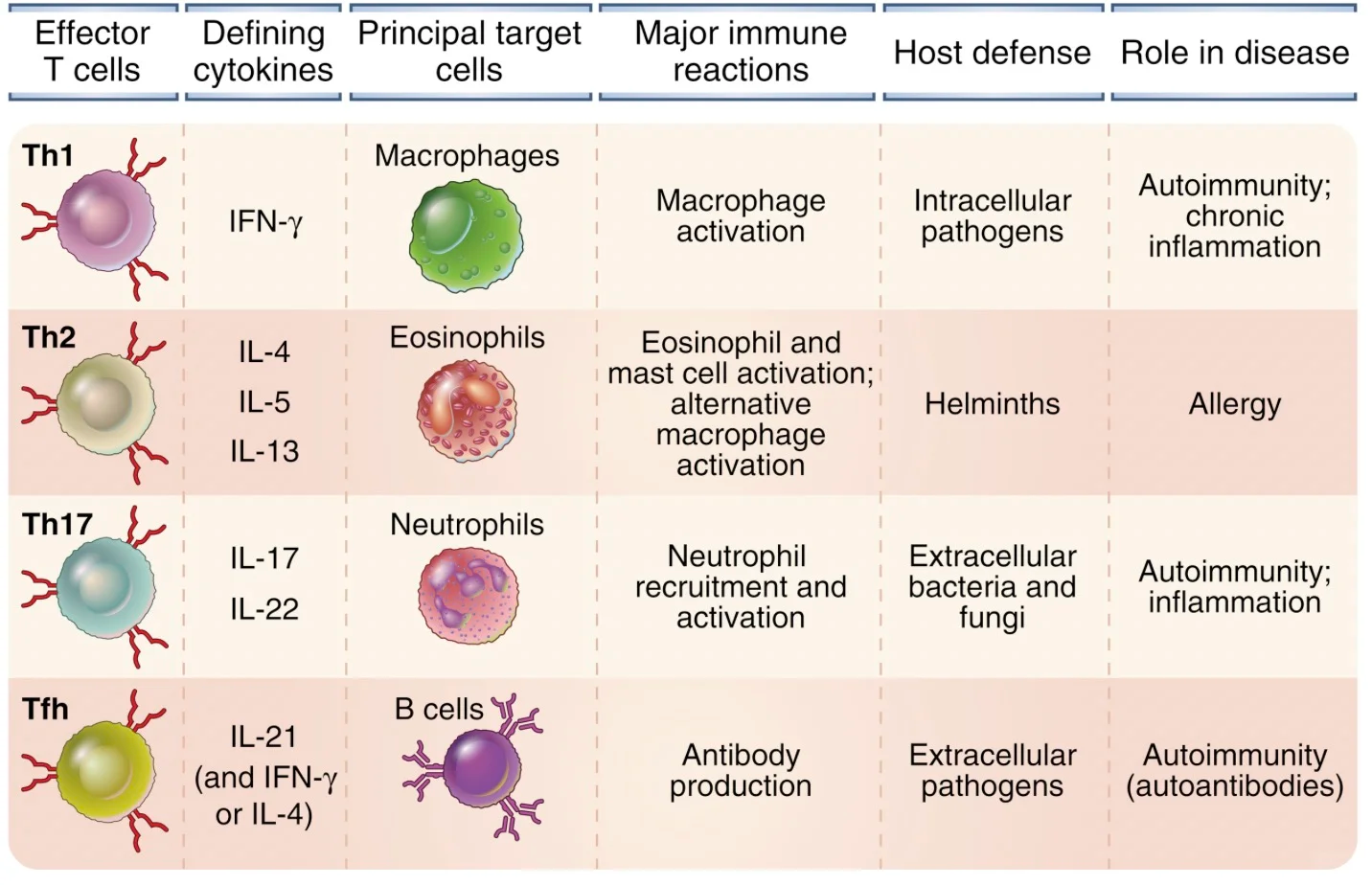 效应 T 细胞是适应性免疫的关键执行者,主要包括 Th1、Th2、Th17、Tfh 四种亚群。Th1 分泌 IFN-γ 激活巨噬细胞,抵御细胞内病原体,过度激活关联自身免疫病;Th2 分泌 IL-4 等,靶向嗜酸性粒细胞等介导体液免疫,防御寄生虫,异常反应引发过敏性疾病;Th17 分泌 IL-17,招募中性粒细胞对抗细胞外细菌真菌,与银屑病等炎症相关;Tfh 分泌 IL-21,促进 B 细胞增殖分化产生抗体,保障体液免疫记忆,功能异常可能诱发自身免疫病。四种细胞各司其职,共同调控免疫防御与稳态。