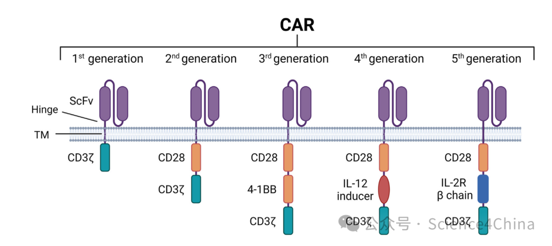 第一代CAR的设计灵感来源于将抗体的抗原识别功能与TCR的信号传导功能相结合。其细胞内信号传导区仅包含CD3ζ链,这种设计的CAR T细胞在临床试验中显示出一定的抗肿瘤活性,但由于其增殖能力、细胞毒性功能和持久性有限,治疗效果并不理想。