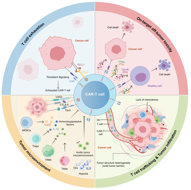 实体瘤的肿瘤微环境通常包含多种免疫抑制性细胞和分子,如调节性T细胞(Tregs)、髓源性抑制细胞(MDSCs)和免疫抑制性细胞因子(如TGF-β和IL-10)。这些因素共同作用,抑制了CAR-T细胞的活性和功能。