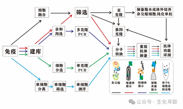 针对某个特定靶点开发创新性抗体药物,第一步是筛选出候选抗体。杂交瘤和抗体库是应用最广泛的抗体筛选技术,单个B细胞基因克隆技术经不断完善也开始用于抗体筛选。杂交瘤包括小鼠、大鼠、仓鼠和家兔杂交瘤技术;抗体库分为噬菌体展示抗体库、无细胞分子展示抗体库(核糖体展示、mRNA展示和DNA展示抗体库)和细胞表面展示抗体库(细菌、真菌、酵母和哺乳动物细胞表面展示抗体库)三大类。