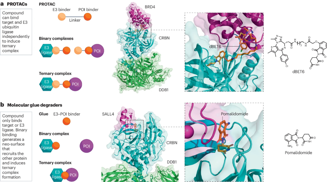 传统上,TPD领域主要有两类降解剂:异双功能蛋白降解靶向嵌合体(PROTAC;图2a)和单价分子胶降解剂(MGD;图2b)。两者均通过诱导靶蛋白与E3连接酶形成三元复合物,促进靶蛋白泛素化及随后的蛋白酶体降解。尽管原理相同,但其化学特征导致分子识别存在差异。