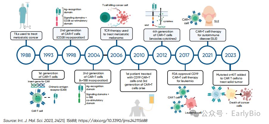 从造血干细胞移植(HSCT)到嵌合抗原受体 T 细胞(CAR-T)疗法的发展,背后反映的是淋巴瘤治疗的进阶之路。其标准的一线治疗是 R-CHOP 方案(利妥昔单抗、环磷酰胺、多柔比星、长春新碱和泼尼松),治疗失败后采用干细胞移植。CAR-T 疗法通常用于三线及更后线的治疗,且应用阶段正逐渐提前。CAR-T治疗方法的演进与肿瘤学疗法进阶之路的类似之处将会晚点讨论。