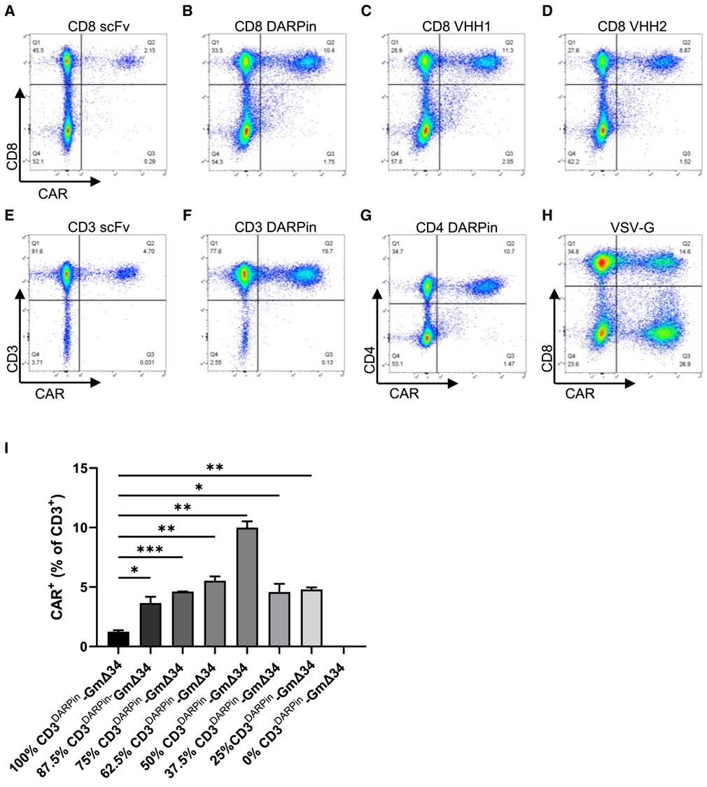 研究人员首先探索了如何提高重定向LV载体的转导效率。他们发现,与单链可变片段(scFv)相比,使用设计的锚蛋白重复蛋白(DARPin)作为靶向分子能够显著提高载体对CD8+ T细胞的转导效率。