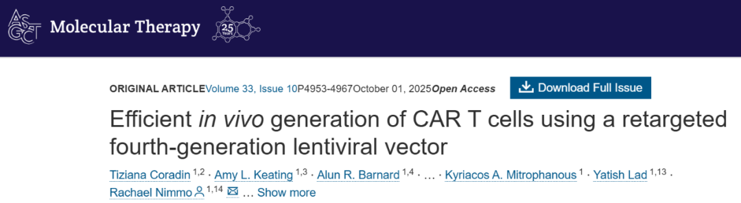 》杂志上发表了一项突破性研究,该研究描述了一种改进的重定向Nipah包膜系统与第四代慢病毒载体相结合的方法,能够在体内特异性靶向T细胞并高效生成功能性CAR-T细胞。