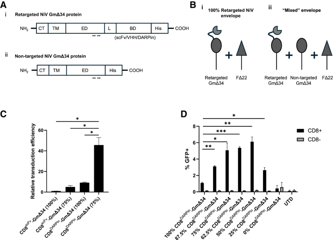 的LV载体显著提高了对CD8+ T细胞的基因转移效率。通过评估不同比例的重定向与非靶向G蛋白,研究人员确定了50%-75%重定向CD8DARPin-NiV Gm△34和25%-50%非靶向NiV Gm△34的最佳范围。重要的是,在所有条件下,载体对不表达CD8的细胞群的转导均保持在最低水平,表明特异性得以保持。