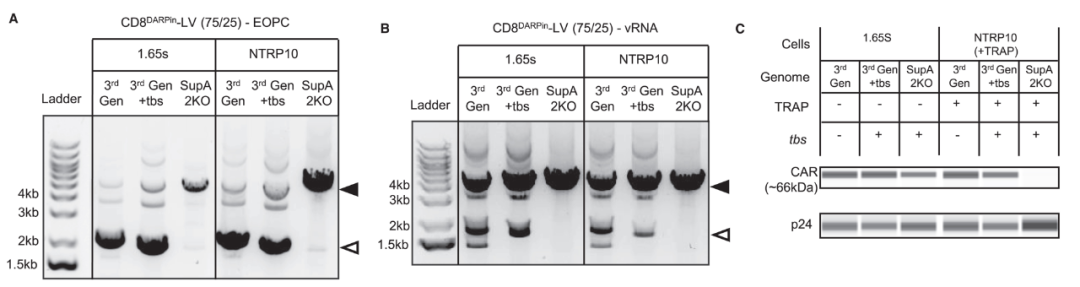 研究表明,使用含有TRAP结合序列(tbs)的SupA2KO-LV载体基因组时,载体颗粒中几乎检测不到CAR蛋白,而在第三代LV基因组中,即使存在TRAP蛋白,CAR蛋白仍然可检测到。这种差异归因于第三代基因组中主要剪接供体(MSD)的强效剪接产生大量表达CAR的剪接vRNA。