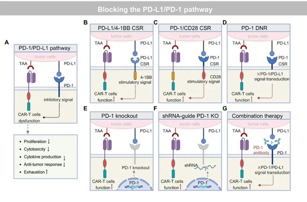 基因敲除/下调:直接用基因编辑技术敲除CAR-T细胞自身的PD-1基因,或者用RNA干扰技术降低其表达。