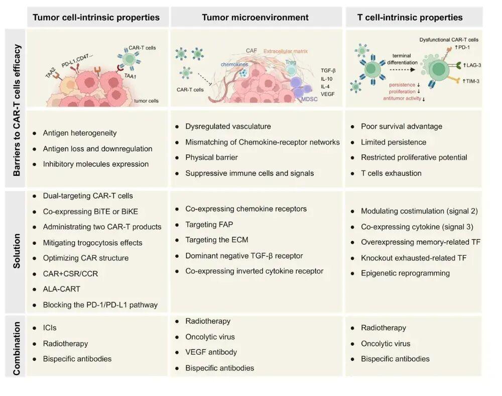 对抗实体瘤,新一代CAR-T的设计思路不再是简单的“识别-杀伤”,而是进化为一个集多靶点、渗透导航、破除屏障、抵抗抑制、自我续航”于一体的综合性活体药物平台,并且需要与放疗、免疫药物等手段协同作战。