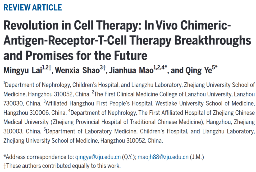 近期,浙江大学医学院附属儿童医院叶青教授、毛建华教授团队针对体内嵌合抗原受体 T 细胞(CAR-T)疗法的突破性进展及未来前景进行了系统综述。相关研究成果以 “Revolution in Cell Therapy: In Vivo Chimeric-Antigen-Receptor-T-Cell Therapy Breakthroughs and Promises for the Future” 为题,发表于Research。该综述全面解析了体内 CAR-T 疗法的核心技术、多疾病应用潜力、关键挑战与创新解决方案,为推动细胞治疗从实验室走向临床规模化应用提供了重要理论支撑与实践参考。