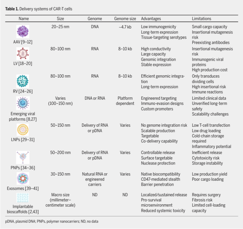 表1 CAR-T细胞的递送系统