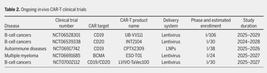相较于传统体外CAR-T,体内CAR-T简化生产流程,保留T细胞天然功能,LNP介导的瞬时表达系统可实现可控表达与重复给药,适配自身免疫病的精细调控需求。在类风湿关节炎、系统性红斑狼疮等疾病模型中已显示抗炎效果,首个临床试验(NCT06917742)启动,标志着该技术进入临床转化阶段。