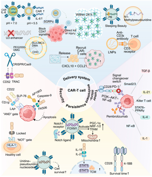 靶向优化:通过抗 CD3 抗体修饰载体、核酸适配体替代抗体等方式,让 CAR 基因精准结合 T 细胞;利用趋化因子响应设计,引导 CAR-T 细胞向病灶主动迁移;