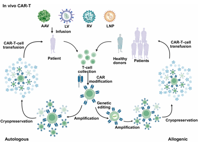 图1 自体、同种异体和体内嵌合抗原受体(CAR)细胞的制备流程02体内CAR-T疗法的核心技术与革新突破