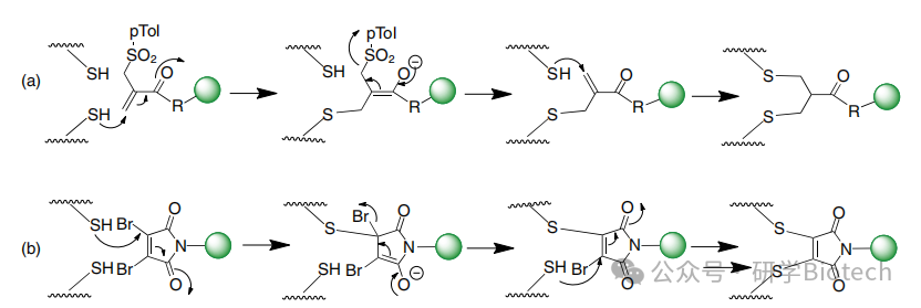 图7 基于单砜(a)或3,4-二溴马来酰亚胺(b)双烷基化反应的二硫键重桥接方法