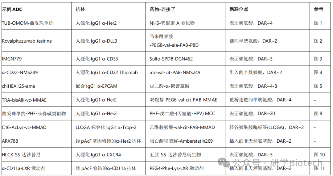 下文将总结药物-连接子设计、抗体工程以及ADC在癌症领域外的潜在应用方面的最新进展。表1提供了ADC代表性技术和构建的概要。