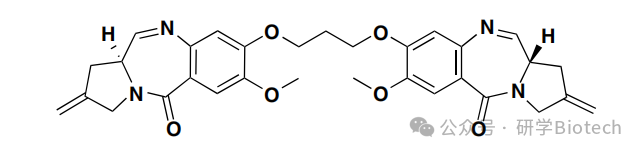 吡咯并苯并二氮杂䓬二聚体是一类强效、序列选择性的DNA小沟结合剂,以SJG-136为例,图2所示。SJG-136也称为SG2000,在支持性护理下,以最大耐受剂量30µg/m²/天,连续给药3天(21天为一个周期),在晚期恶性肿瘤中显示出初步的抗肿瘤活性迹象。通常,每个PBD单体在N10-C11位置含有一个亲电亚胺基团,可与鸟嘌呤碱基的C2-NH₂基团共价连接。PBD能在低皮摩尔浓度下诱导DNA链间交联和细胞毒性。