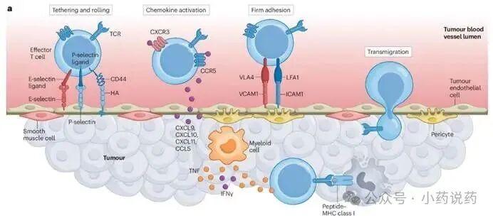 T细胞从血管迁移到外周组织是一个复杂的多步骤过程,涉及协调的粘附和信号事件,统称为粘附级联。这种级联反应由T细胞上表达的归巢受体与其内皮细胞上相应配体之间的相互作用介导,取决于靶组织的解剖位置和T细胞状态。效应T细胞从血管归巢到肿瘤组织包括四个主要阶段:粘附与滚动、趋化因子激活、牢固粘附和迁移。