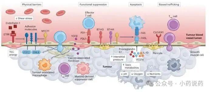 总的来说,肿瘤血管系统高度异常,可以通过多种机制抑制效应T细胞进入肿瘤,并促进Treg细胞等免疫抑制细胞的肿瘤渗入。