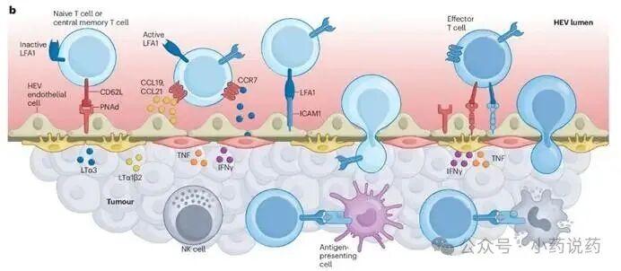 炎症肿瘤中HEV的异位形成受免疫细胞信号的调节。例如,CD8+T细胞(通过IFN-γ、TNF、LTα3和LTα1β2)和NK细胞(通过IFN-γ和LTα2β2)促进其形成,而Treg细胞通过其对CD8+T细胞的抑制活性阻止其形成。循环幼稚T细胞的局部募集是由CCL19和CCL21趋化因子介导的,这些趋化因子在HEV或附近的肿瘤相关基质细胞中被IFN-γ上调。它们与CCR7的结合激活了LFA1,使幼稚T细胞牢固粘附,并通过HEVs细胞连接处归巢到肿瘤。肿瘤相关的HEV还可以上调P-选择素和E-选择素的表达,并使活化的淋巴细胞能够归巢。