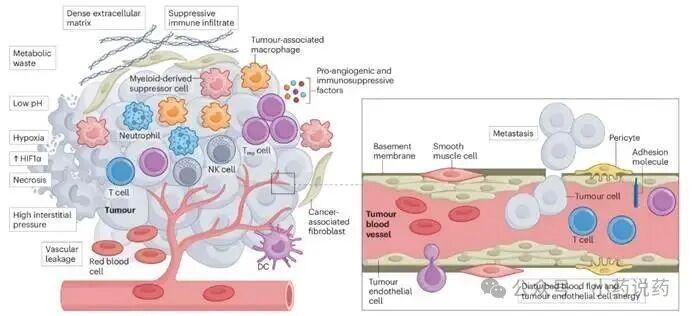 肿瘤血管通常是曲折的,表现出不规则的分支模式,与正常组织中的血管相比,其直径通常更大。此外,这些血管的细胞和结构成分,包括肿瘤内皮细胞(TEC)、周细胞(包裹TEC的壁细胞)和基底膜组织异常。例如,TEC可能具有更大的细胞间隙,导致血管通透性增加。这种异常的渗透性导致间质液压力增加,从而导致血管塌陷、血瘀和坏死。肿瘤血管的另一个特点是血流缓慢且紊乱,动脉和静脉循环血流之间的过渡不明确,在动脉和静脉系统之间缺乏明确的方向,交换血管之间的距离增加。这些异常阻碍了氧气和营养物质向TME的有效输送,并阻碍了代谢废物的清除,从而产生了缺氧、酸性和有毒的微环境。这些条件不仅促进了对抗凋亡和易转移的肿瘤细胞的选择,而且对T细胞的功能和持久性具有高度抑制作用。