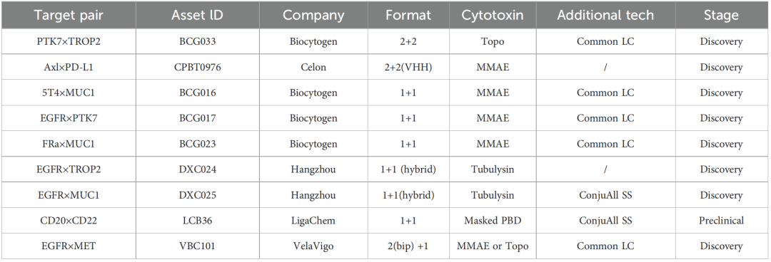 原文列举了多种处于临床前和早期研究阶段的双特异性ADC实例,并指出该策略有助于改善低表达靶点的递送效率。