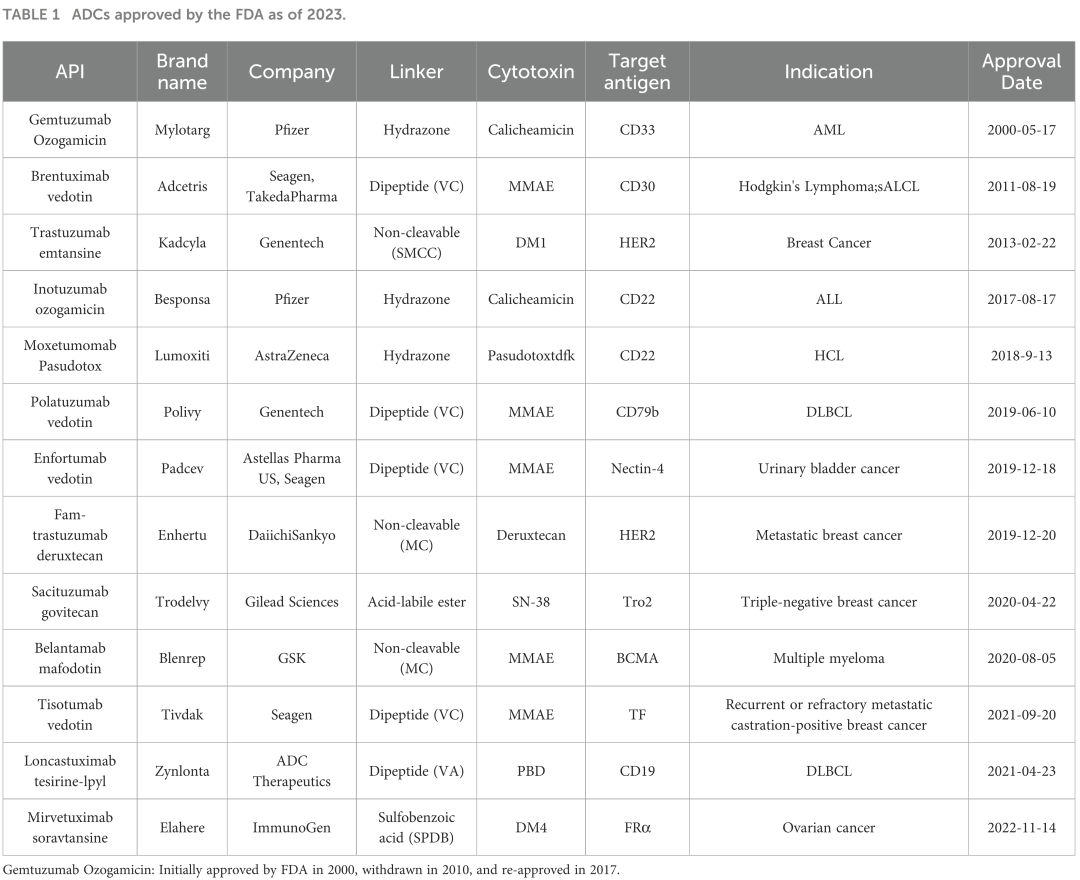 自2000年首个ADC药物获批以来,截至2023年底,美国FDA已批准13款ADC药物上市,同时至少有100种ADC处于不同阶段的临床研究中。近年来,以fam-trastuzumab deruxtecan-nxki(Enhertu®)为代表的ADC在多种肿瘤中显示出显著疗效,推动了该领域的快速发展。