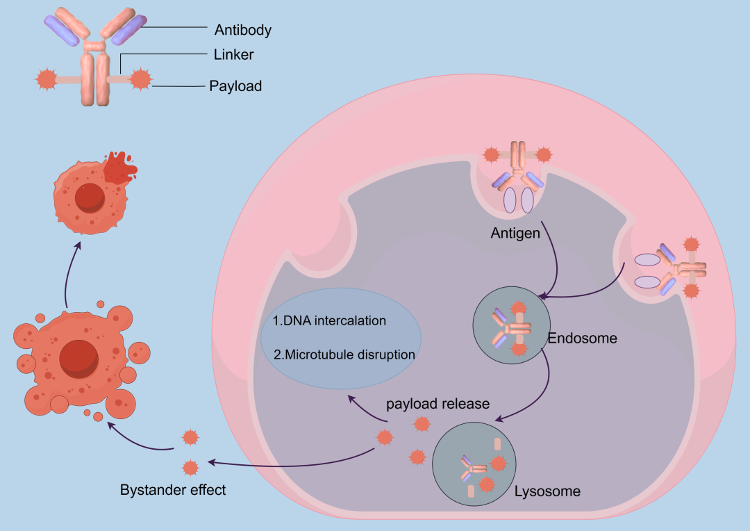 ADC通过抗体与肿瘤细胞表面抗原结合后发生内吞,在溶酶体环境中释放载荷。释放后的载荷通过抑制微管动态或诱导DNA损伤等机制导致肿瘤细胞死亡。部分疏水性载荷可扩散至邻近细胞,产生旁观者效应,从而在一定程度上克服抗原表达异质性。