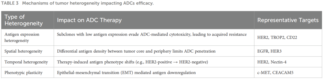 肿瘤异质性是ADC疗效不稳定的重要原因之一。如在空间层面,不同肿瘤区域内靶抗原表达水平存在显著差异,导致ADC仅能杀伤部分肿瘤细胞;在时间层面,靶抗原表达可能随疾病进展发生变化。
