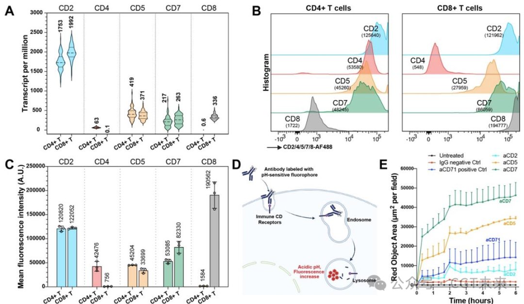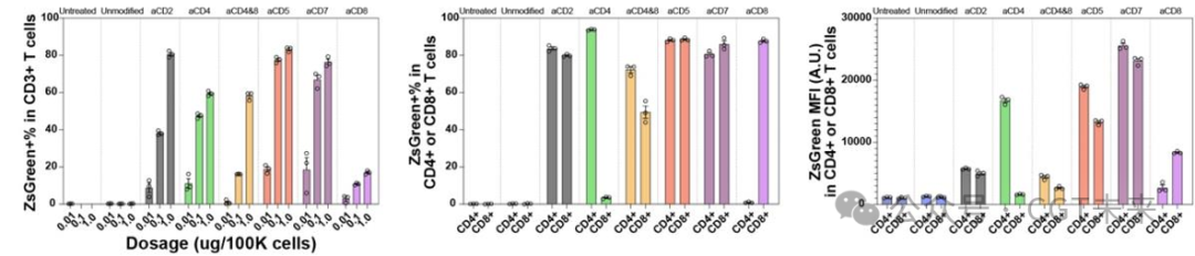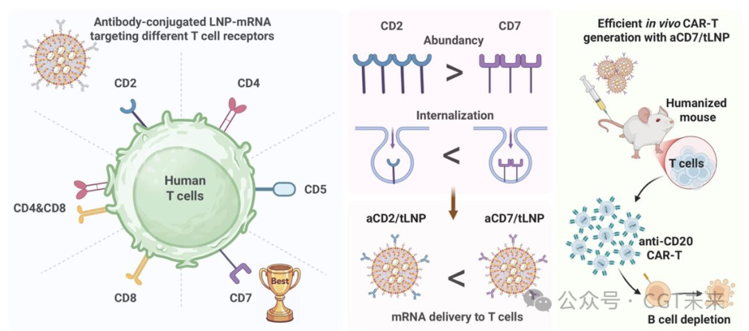使用公开的转录组数据和流式细胞术分析T细胞表面受体(CD2、CD4、CD5、CD7、CD8)的表达水平,CD2的表达量最高,是CD7和CD5的5倍,但CD2的mRNA递送效率远低于CD7和CD5。