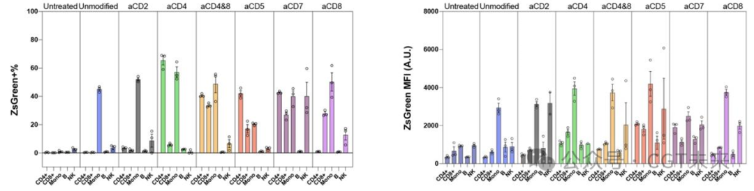 使用ZsGreen报告基因mRNA作为tLNP的负载物,在人类T细胞中进行递送实验,靶向CD7的tLNP在CD4⁺和CD8⁺ T细胞中均表现出最高的递送效率和蛋白表达水平,aCD7/tLNP的ZsGreen阳性率高达76.4%,显著优于其他靶向分子。