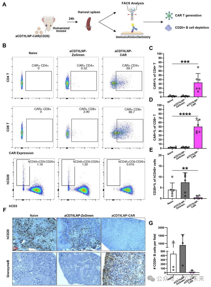 在PBMC-NSG人源化小鼠中,通过尾静脉注射aCD7/tLNP-CAR mRNA,评估CAR T细胞生成和B细胞清除效果。aCD7/tLNP-CAR处理后,CD4⁺和CD8⁺ T细胞的CAR表达率分别为33.3%和50.6%,显著高于靶向CD2的tLNP。aCD7/tLNP-CAR处理的小鼠脾脏中,CD20⁺ B细胞比例显著降低,仅为0.5%,相比对照组(4.1%-7.5%)减少了90%以上。免疫组织化学显示,aCD7/tLNP-CAR处理的小鼠脾脏中CD20⁺ B细胞几乎完全清除,同时观察到Granzyme B的强阳性染色,表明CAR T细胞具有强大的细胞毒性活性。