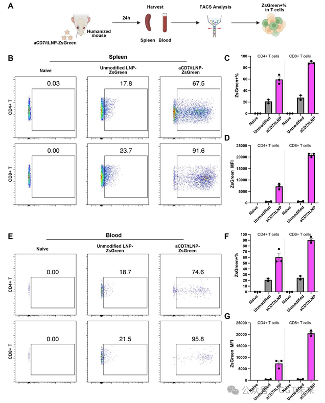 使用人源化小鼠模型(PBMC-NSG小鼠),通过尾静脉注射aCD7/tLNP-ZsGreen,评估mRNA递送效率。在脾脏T细胞中,aCD7/tLNP处理后CD4⁺和CD8⁺ T细胞的ZsGreen阳性率分别为59.3%和88.7%,在外周血T细胞中,ZsGreen阳性率与脾脏中的结果相似,CD8⁺ T细胞的ZsGreen表达水平显著高于CD4⁺ T细胞,这与CD8⁺ T细胞表面更高的CD7表达量一致。