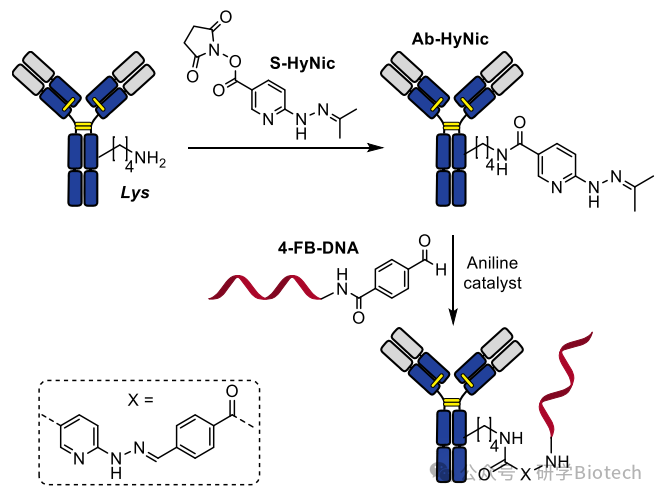 腙偶联:抗体首先与琥珀酰亚胺基4-羟基烟酰胺酮丙酮肼(SHyNic)反应,以在抗体中引入亲核性肼基团(图11所示)。