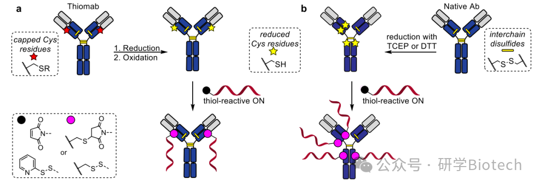 半胱氨酸残基偶联:通过基因工程将额外的保护性半胱氨酸残基整合到抗体结构中(硫醇化单抗技术)。这类抗体可用于将单抗与通过 SMCC 或 SPDB 交联剂获得的巯基反应性寡核苷酸(ON)连接,但需先进行初步去保护步骤,将保护性半胱氨酸残基转化为游离巯基(图14a所示)。另外通过部分还原抗体链间二硫键可生成游离巯基(图14b所示;参见图15中的方案)。