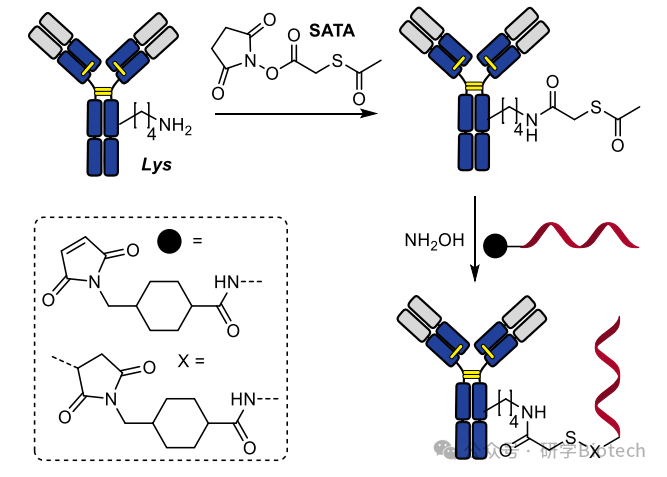 SATA试剂常用于在蛋白质赖氨酸残基上引入保护性硫醇基团。随后可使用羟胺轻松脱保护。该方法适用于单克隆抗体的潜在硫醇化修饰。具体步骤:首先用SATA修饰抗体以引入保护性硫醇残基;接着用 SMCC 修饰DNA片段,生成含马来酰亚胺的DNA;最后通过向SATA修饰的抗体中加入羟胺(生成游离硫醇基团)并加入活化的DNA-马来酰亚胺片段,启动偶联反应。(图10所示)