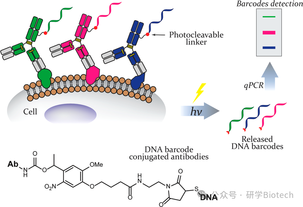 采用可光解的双功能马来酰亚胺-NHS交联剂,制备可光解DNA条形码-抗体偶联物,用于提高单个活细胞中蛋白质的检测灵敏度(图9)。该修饰使得DNA条形码可通过光解释放,从而在靶标结合后实现其分离、扩增和读取。