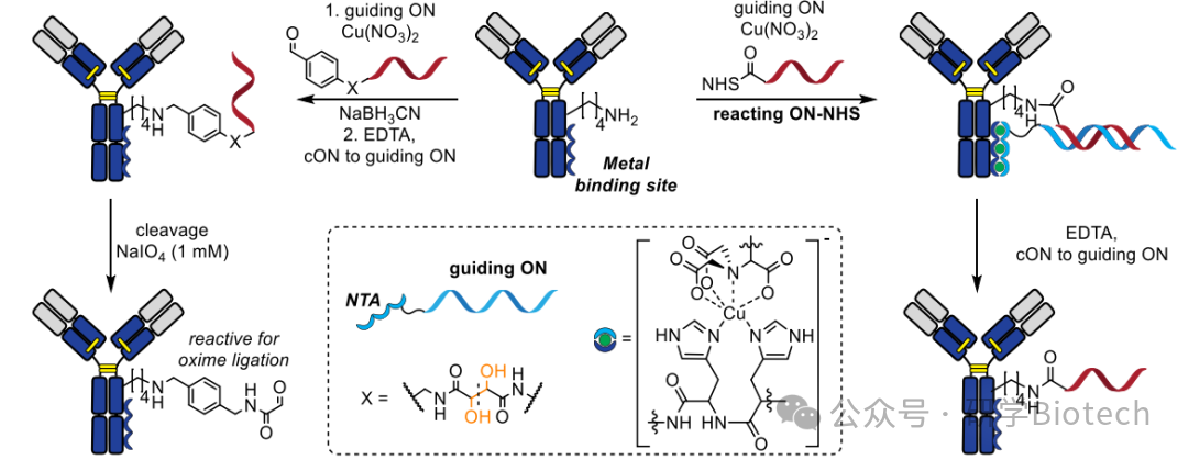 图13. 利用天然抗体的金属结合位点进行DNA模板介导的近端赖氨酸偶联,用于抗体中AOC生成(右)或醛基引入(左)