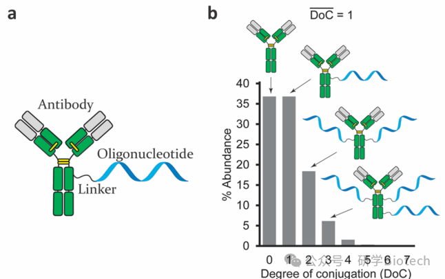 图1. (a) AOC的简化示意图,(b) 平均DoC为1的赖氨酸偶联型AOC中不同DoC值组分的典型分布。
