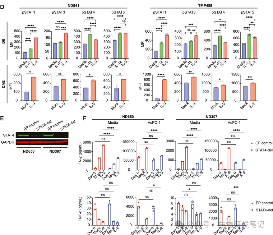 研究发现,IL-9信号不仅能激活经典的STAT3和STAT5通路,还意外地、强效地激活了STAT4。STAT4传统上被认为是IL-12信号的关键介质,与Th1细胞分化和IFN-γ产生密切相关。通过CRISPR-Cas9技术敲除STAT4基因证实,STAT4是IL-9信号发挥增强作用(尤其是诱导IFN-γ产生)的关键分子。这表明IL-9通过激活STAT4,赋予了CAR-T细胞更优越的功能特性。