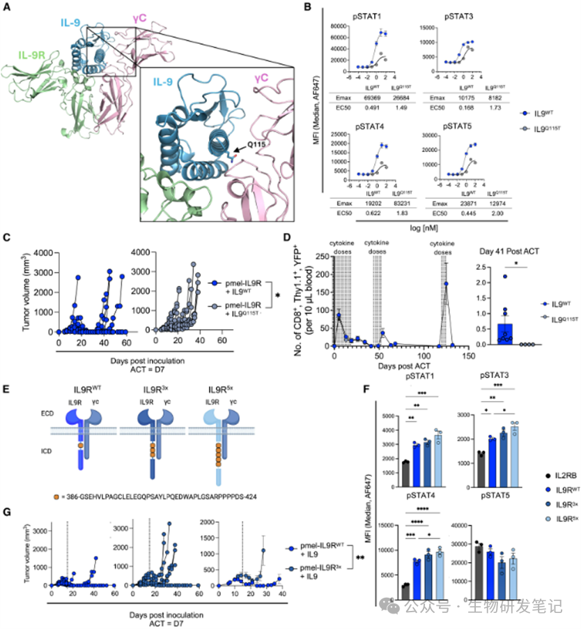 研究团队通过结构生物学指导,对IL-9或IL-9R进行改造,分别削弱(如IL-9Q115T突变)或增强(如IL-9R3x/5x突变)其信号。结果表明,无论是信号减弱还是过度增强,都会削弱T细胞的抗肿瘤效果。这说明天然的IL-9/IL-9R信号强度本身就处于一个最优区间。
