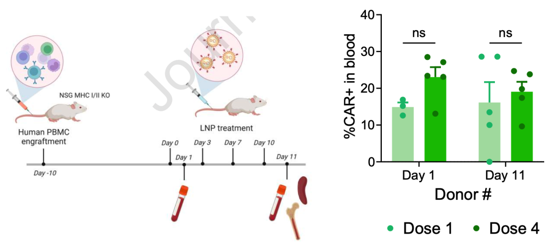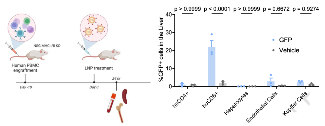 体外实验完成,开始体内实验:人源化小鼠体内,纳米抗体修饰的LNP特异性介导CD8 T细胞表达GFP