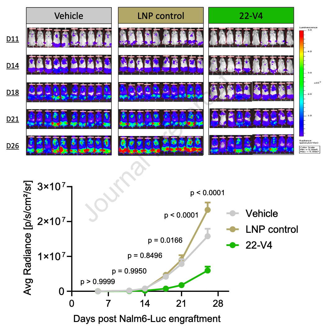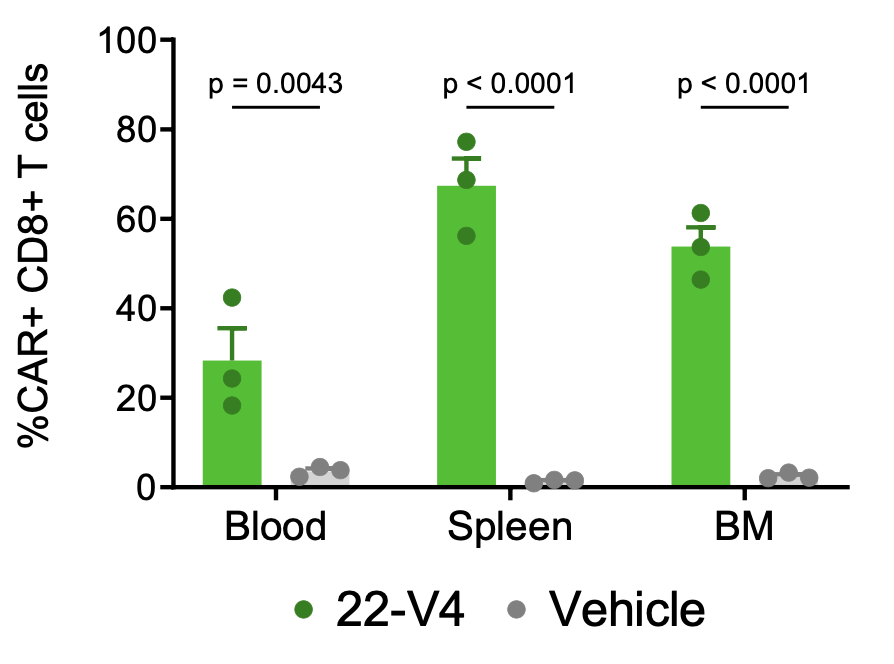 人源化小鼠体内,纳米抗体修饰的LNP特异性介导多部位CD8 T细胞表达靶向CD22的CAR