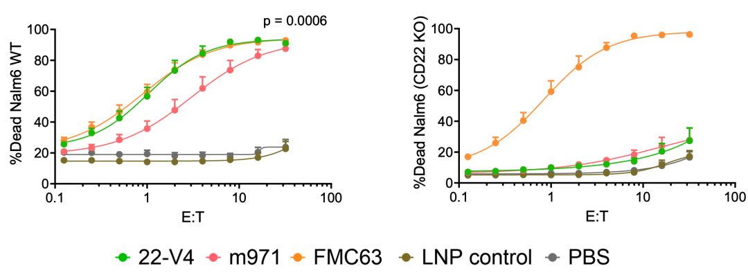 体外,LNP制备出的CAR-T特异性杀CD22+靶细胞(22-V4指示靶向CD22的CAR,m971指示靶向另一个靶向CD22的CAR,FMC63指示靶向CD19的CAR)