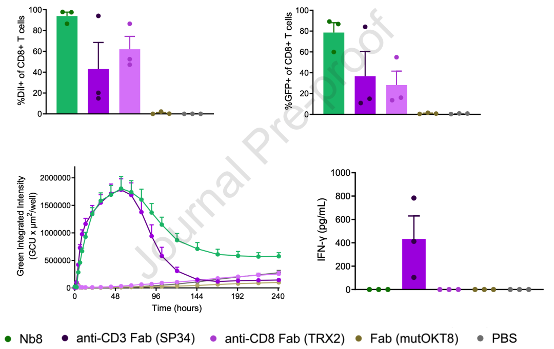筛靶向T细胞的抗体部分:Dil标记的LNP递送GFP mRNA(摄取、表达双角度),筛到纳米抗体Nb8(靶向CD3的SP34会刺激T细胞分泌IFNr)