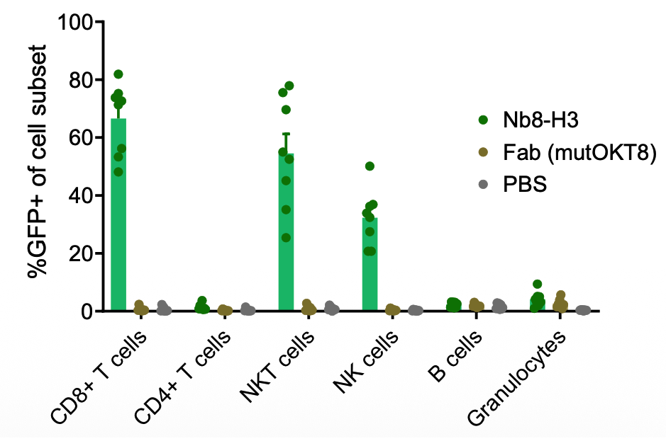 人源化纳米抗体,得到Nb8-H3,体外,Nb8-H3修饰的LNP除了介导CD8 T细胞表达GFP外,还会介导NKT和NK细胞表达GFP