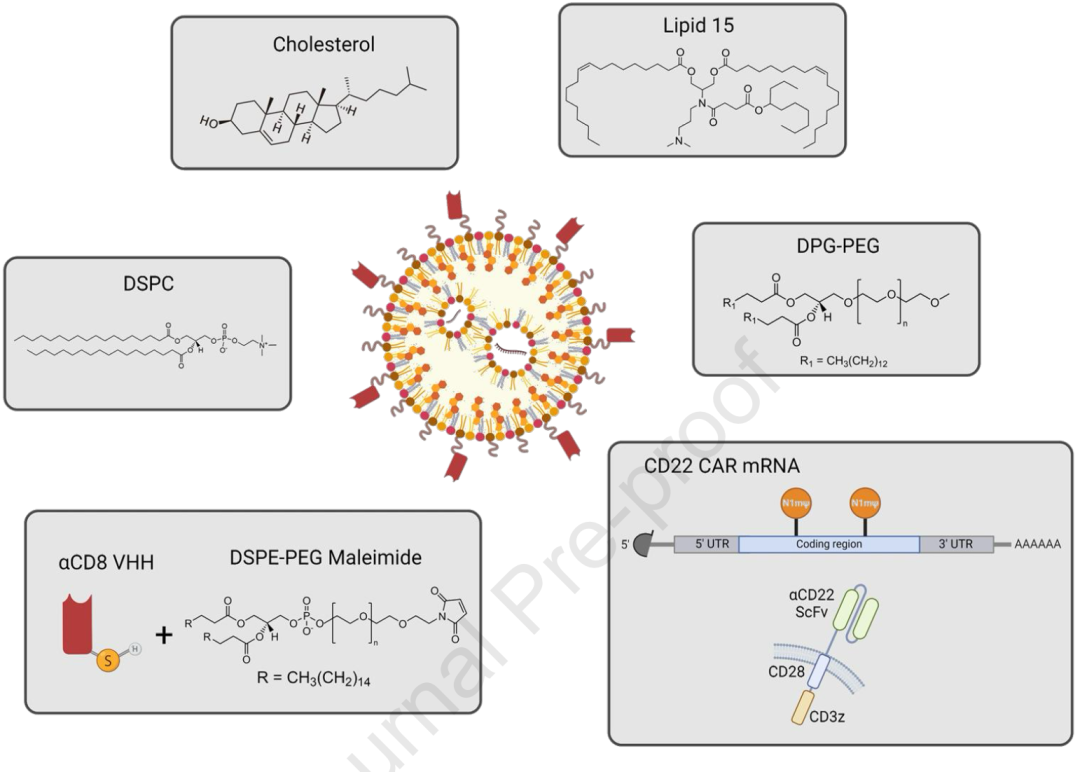 文章做的是CD8纳米抗体修饰的LNP递送靶向CD22的CAR mRNA:对离子化脂质、PEG脂质进行了筛选,通过点击化学在LNP表面安装CD8纳米抗体