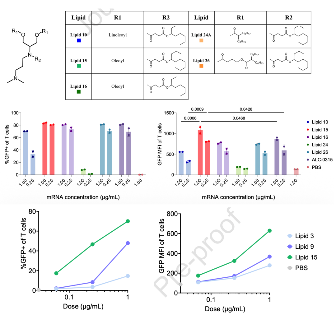 筛选递送效率高的离子化脂质:LNP递送GFP mRNA,筛到了脂质15