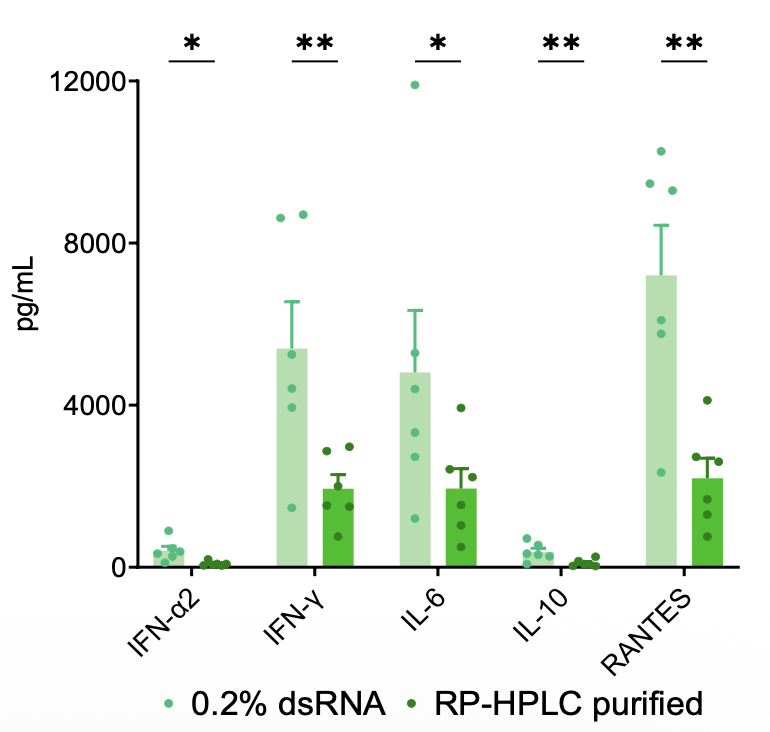 mRNA如果不纯,其中的dsRNA会引起细胞因子分泌,纯化后改善 – 暗示mRNA生产工艺很关键